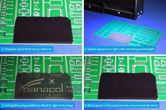 These new Black&Light adhesives are mainly targeted at applications in optical bonding and optoelectronics where high optical density is needed. They are also suitable for optoelectronic applications to help minimize reflections and enhance sensor transmission values, or the black uv epoxies can be applied as glob top or encapsulation.
